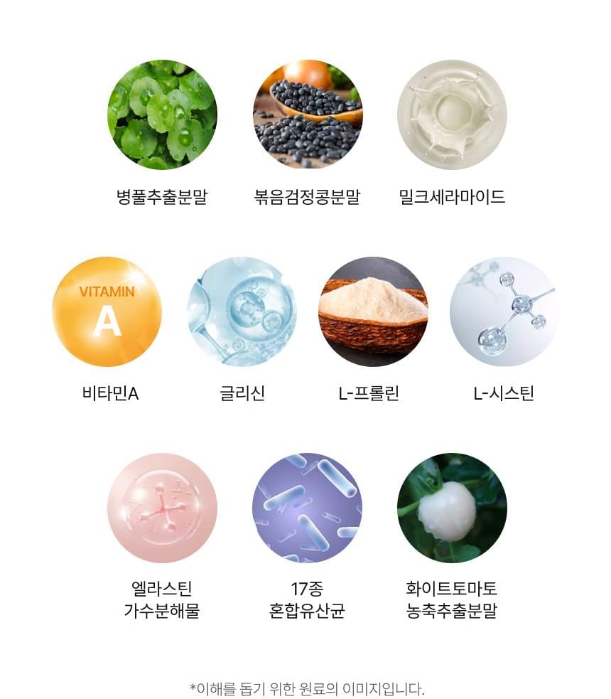 Further contains Low Molecular Fish Collagen, Centella Asiatica Extract, Fried Black Bean Powder, Milk Ceramide, Vitamin A, Glycine, L-Proline, L-Cystine, Hydrolyzed Elastin, Mixed 17 types of Lactic Acid Bacteria and White Tomato Concentrate Extract Powder.