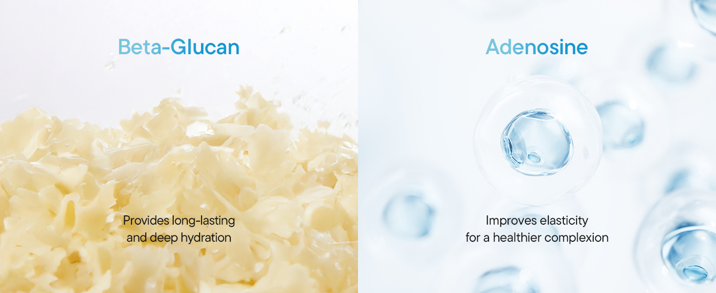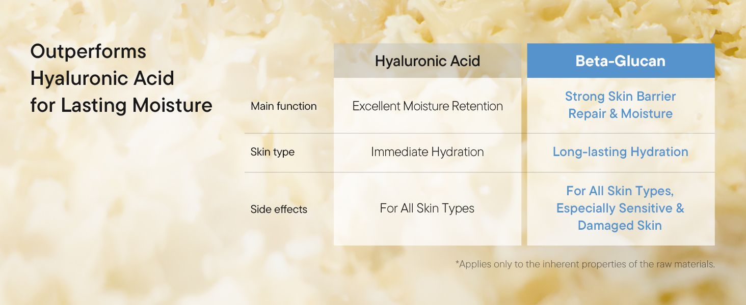 KEY INGREDIENT: BETA-GLUCAN. Beta-glucan is a naturally-derived polymer polysaccharide extracted from the wall of the mushroom yeast cell. It has a 20% higher moisture capacitance than hyaluronic acid; it improves skin elasticity.