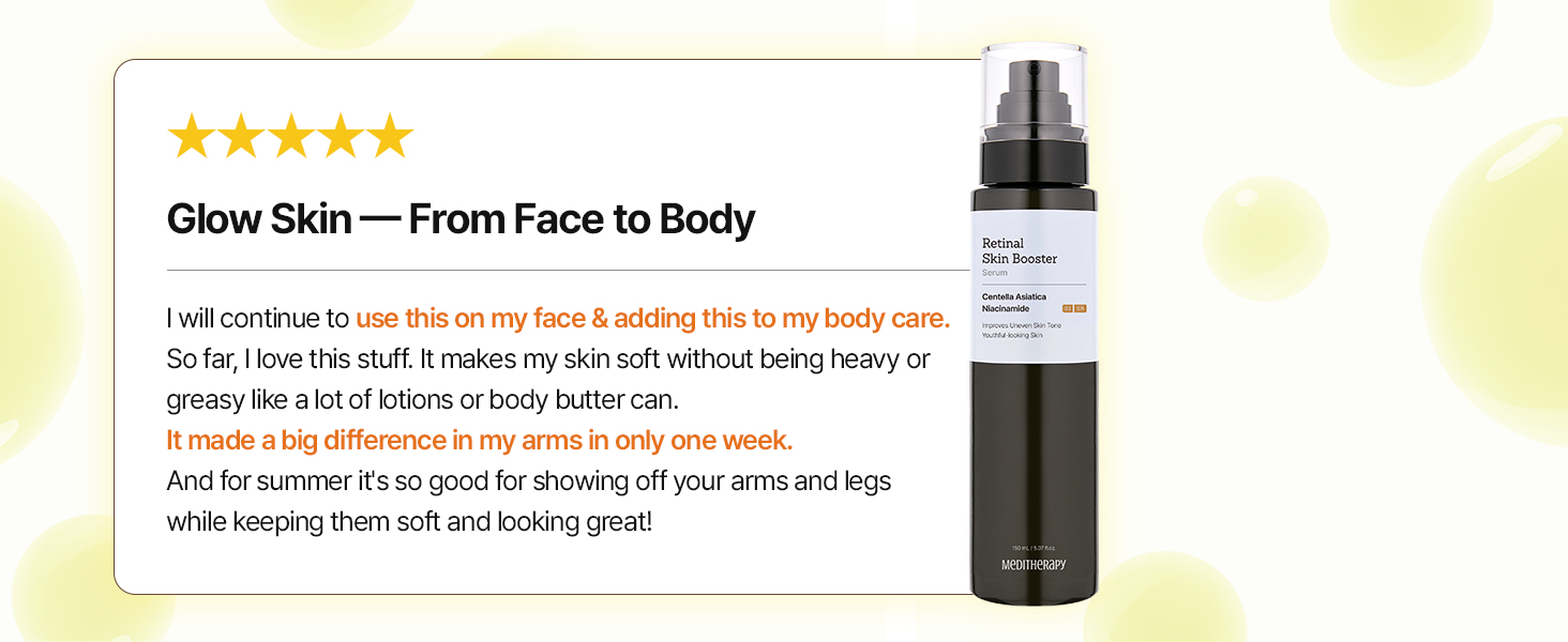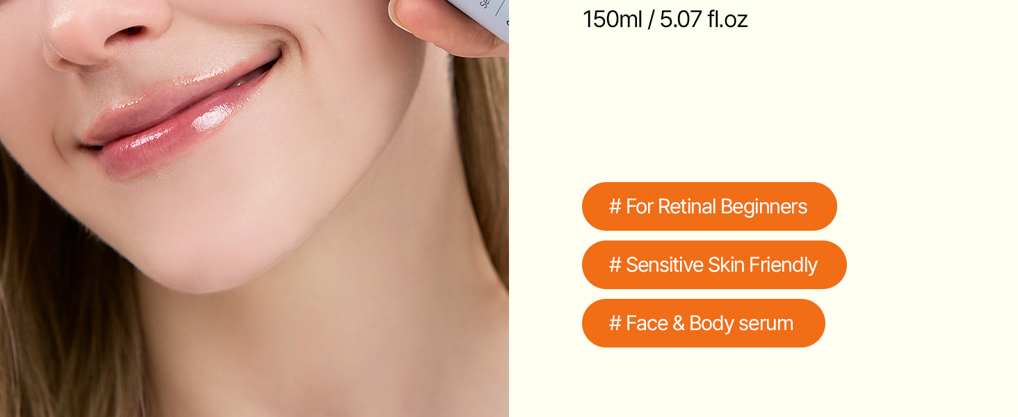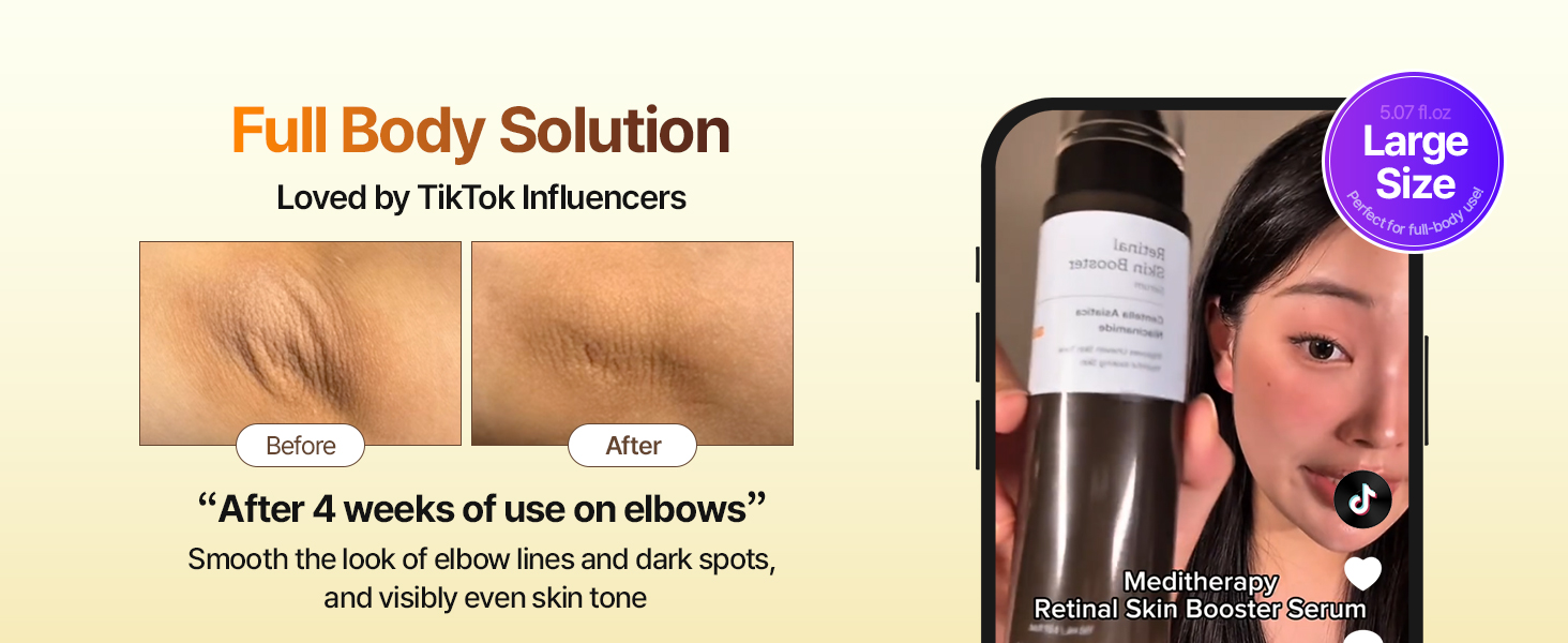 [Multipurpose Retinal Body Serum] – Not just for the face! This gentle yet effective formula also works wonders on rough or dull areas like elbows, knees, and arms—helping improve texture and tone with daily use. Experience smoother, more even-looking skin from head to toe