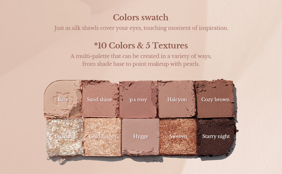 [10-SHADE PALETTE] This 10-shade palette features basic shades like sultry sand or tempting taupe. With a little help of shimmering to dazzling, bold glitters, you can make your eyes pop. It delivers from matte and satin to shimmery and metallic finishes upon your favorite eye-makeup look.