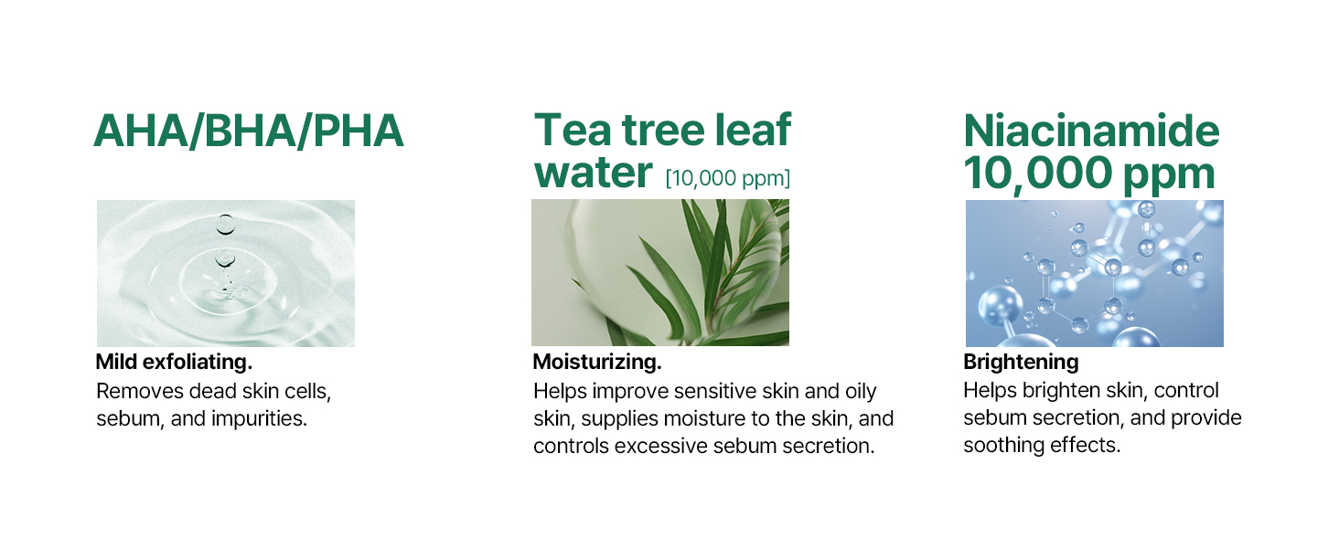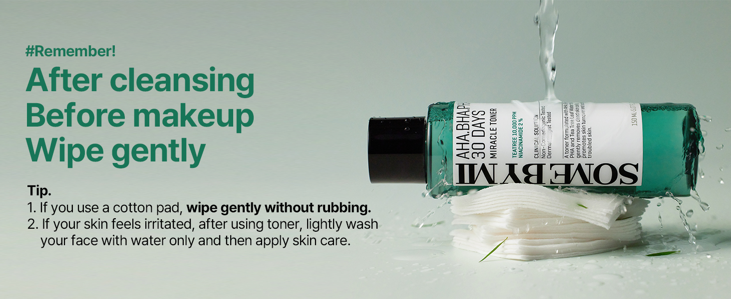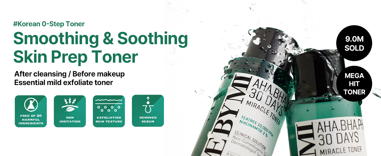 MIRACLE TONER : The Korean toner helps to refine skin texture in the first step of skincare, ensuring a smooth base for makeup application. This AHA BHA toner is particularly effective due to its inclusion of AHA/BHA/PHA ingredients, which gently exfoliate dead skin cells and impurities, leaving the skin clear and smooth. Additionally, the high concentration of tea tree extract in this pore care toner soothes and treats troubled skin, making it an essential part of any Korean skincare routine