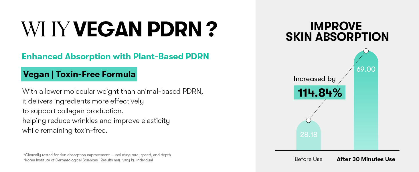 [VEGAN 100,000 PPM PDRN] Our PDRN essence is uniquely sourced from Korean wild ginseng, offering a superior plant-based alternative to commonly used fish-derived PDRN. With its low molecular weight and enhanced stability, it ensures excellent absorption for maximum efficacy.